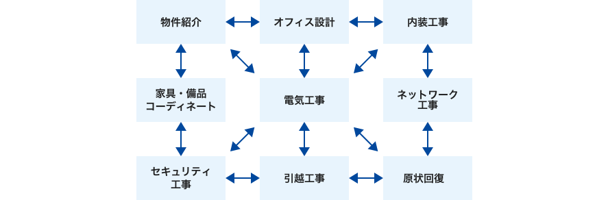 オフィス移転は時間のかかるプロジェクトであり、また関係各所とのさまざまな協議・交渉が行われます。双日ライフワンでは、ビルオーナーやさまざまな業者との調整を代行、効率的な工程に基づく移転プロジェクトをご提案いたします。